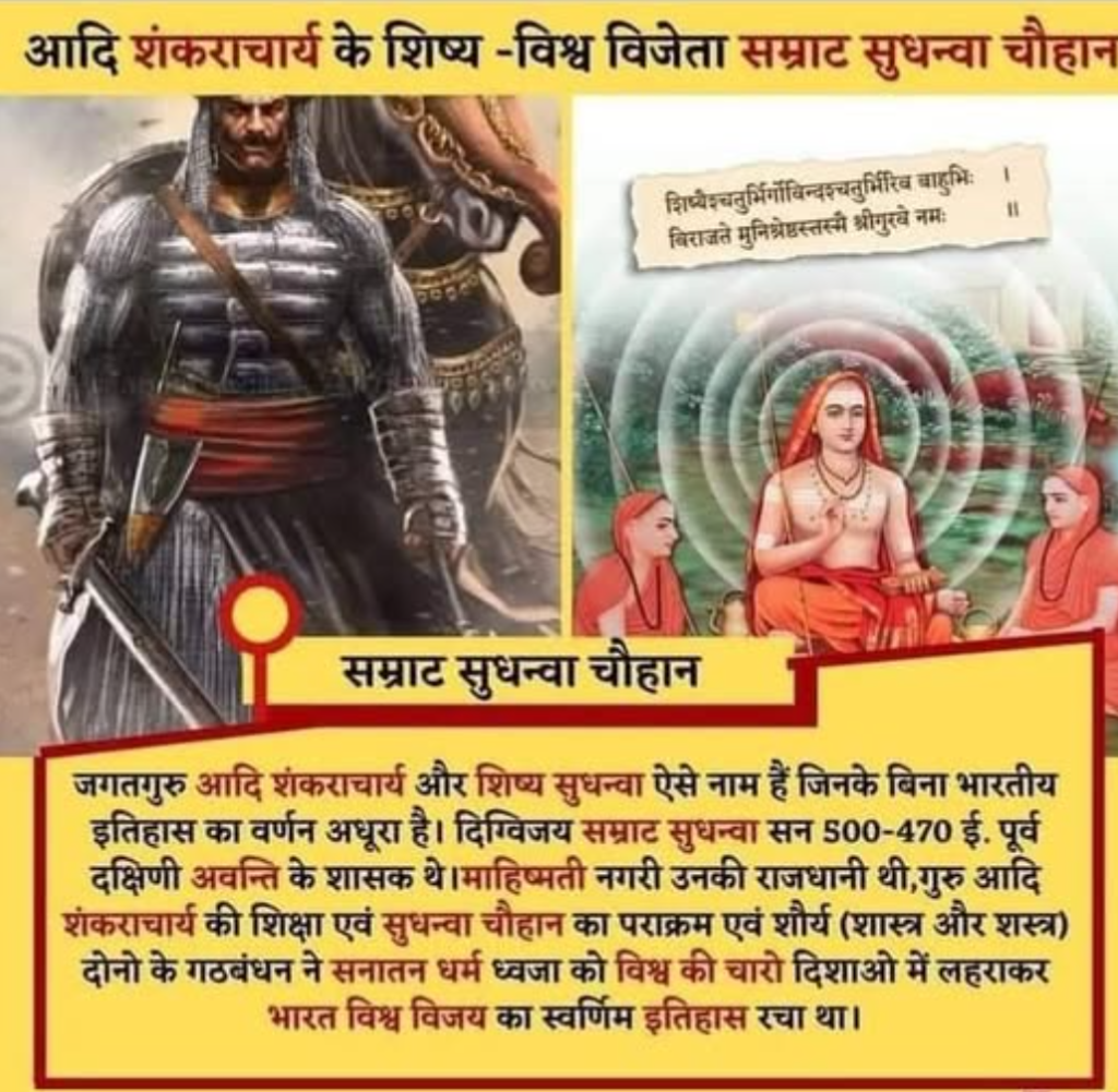 दिग्विजय सम्राट सुधन्वा सन ५००-४७० ई. पूर्व दक्षिणी अवन्ति के शासक थे। माहिष्मती नगरी उनकी राजधानी थी जो वर्तमान काल में मध्यप्रदेश के निमाड़ जनपद में महेश्वर नामक स्थान के रूप में ज्ञात हैं । सुधन्वा को विश्व सम्राट बनाने के पीछे आद्य गुरु शंकराचार्य की अशेष कृपा थी। आद्य शंकराचार्य की शिक्षा एवं सुधन्वा का पराक्रम एवं शौर्य (शास्त्र और शस्त्र) दोनो के गठबंधन ने सनातन धर्म ध्वजा को विश्व की चारो दिशाओ में लहराकर भारत विश्व विजय का स्वर्णिम इतिहास रचा था।
